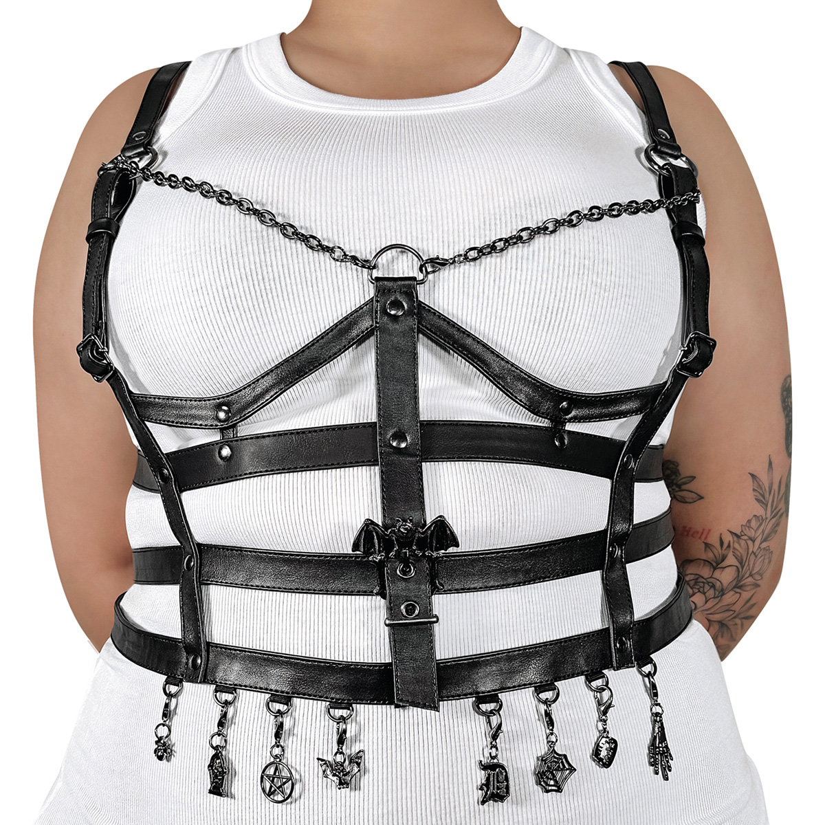 Faux Leather Cage Body Harness w/ Adjustable Shoulder Strap, Ornamental Bat Buckle Center, Removable Hanging Charms & Chain Bra Details, Adjustable Back Buckle Straps