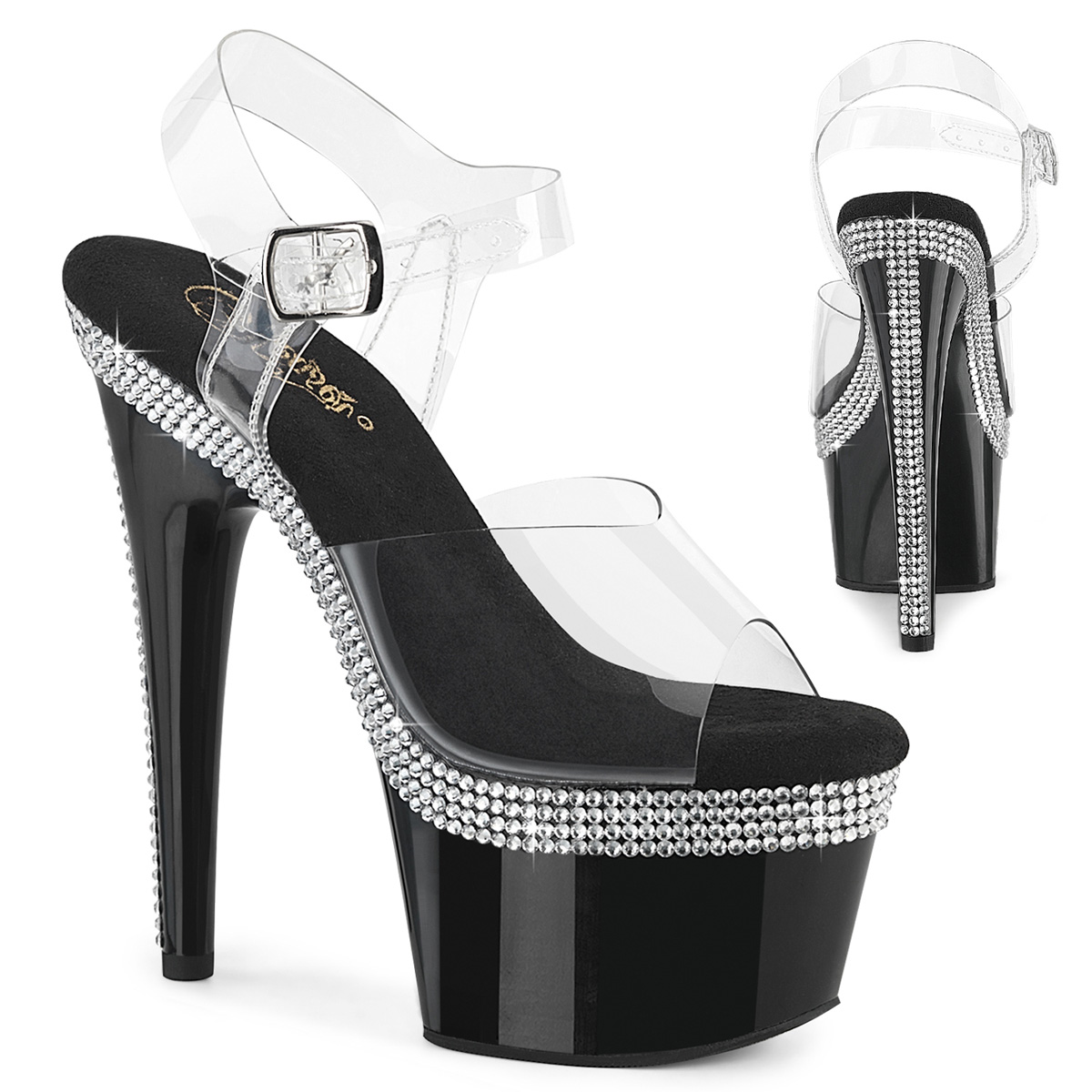 7" (178mm) Heel, 2 3/4" (70mm) Platform Ankle Strap Sandal Featuring Multiple Rows of Rhinestones on the Platform Top Edge and Heel