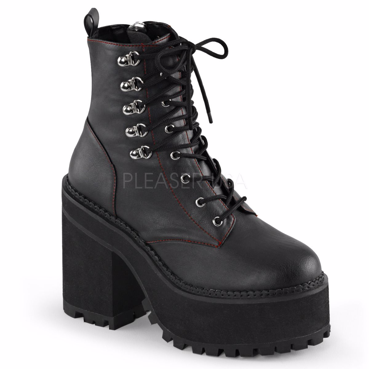 4 3/4 inch (12.1 cm) Block Heel, 2 1/4 inch (5.7 cm) Cleated Platform Double D-Ring Lace-Up Front Ankle Boot with Red Stitch Detail, Inside Zip Closure