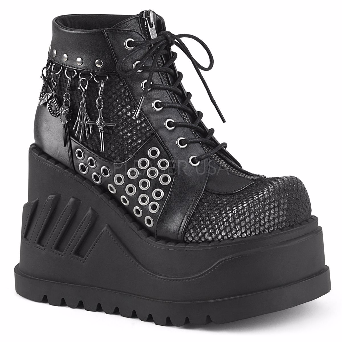 4 3/4 inch (121mm) Platform Lace-Up Front Wedge Bootie Featuring Fishnet Overlay on Vamp, Eyelets on Outer Side Panel, Non-Functioning Zipper Detail on Tongue, and D-Rings w/ Various Dangling Charms, Inside Metal Zip Closure