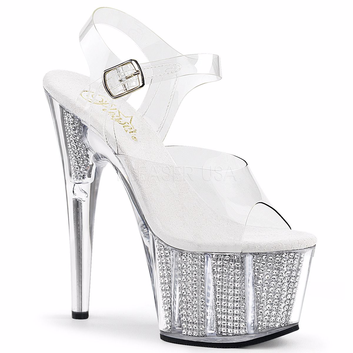 7 inch (17.8 cm) Stiletto Heel, 2 3/4 inch (7 cm) Platform Ankle Strap Sandal Featuring Simulated Rhinestone Filled Platform