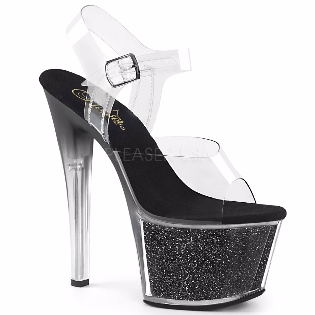 7 inch (178mm) Heel, 2 3/4 inch (70mm) Platform Ankle Strap Sandal w/ Tinted Heel Featuring Glitter Inserts in the Platform Bottom